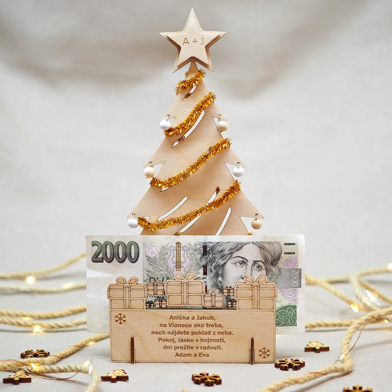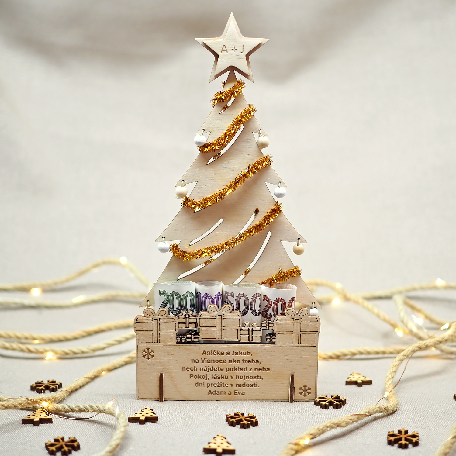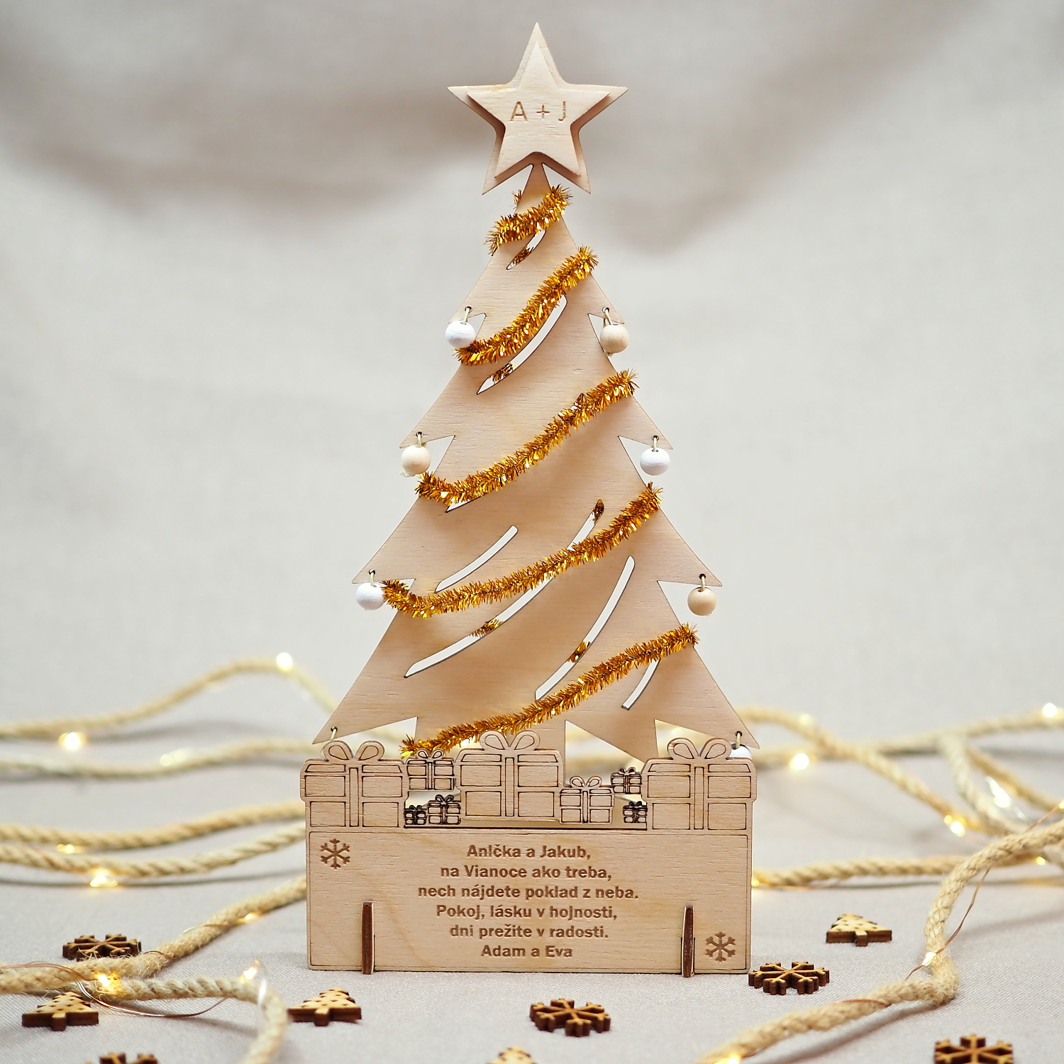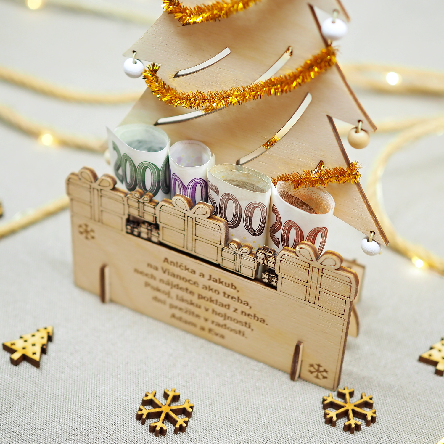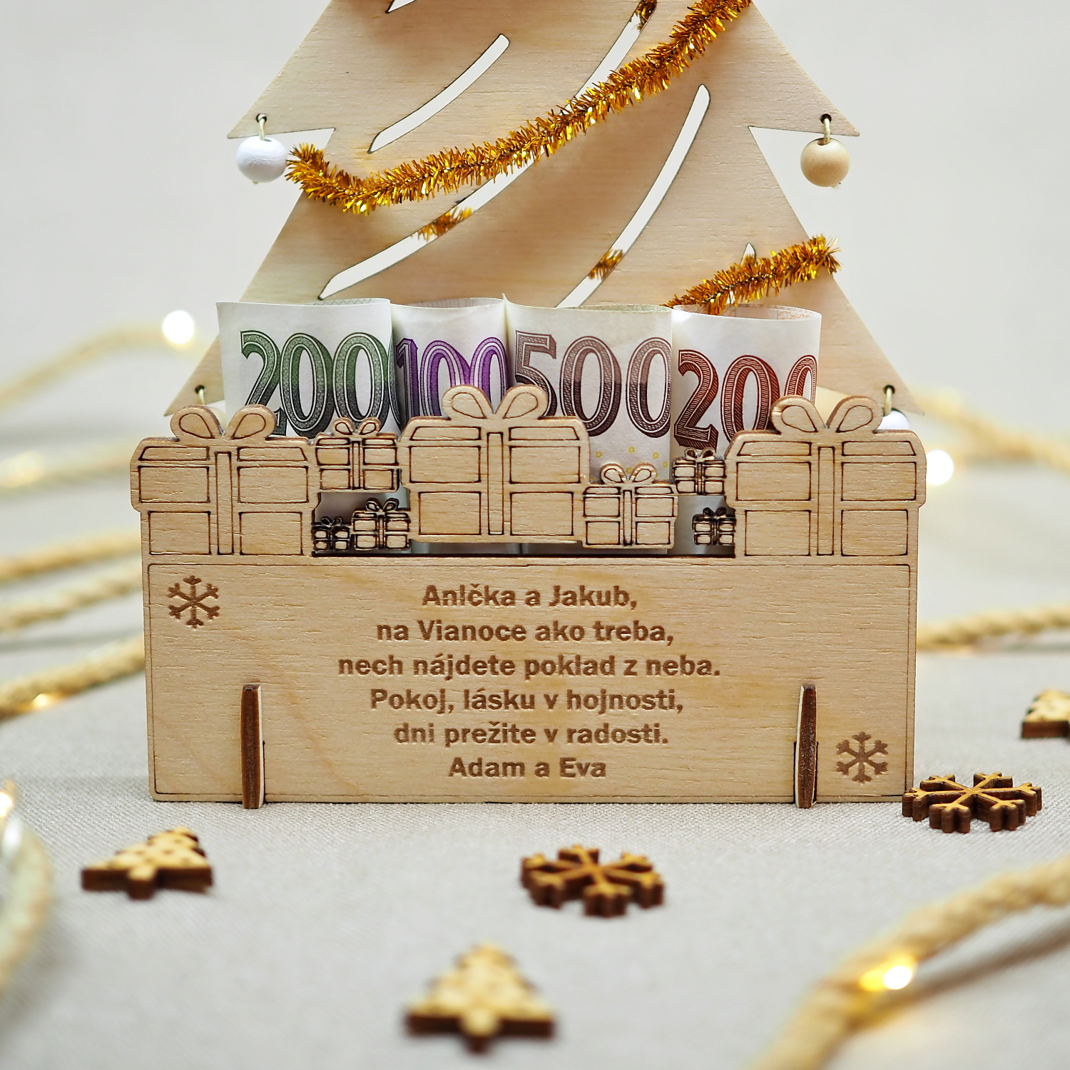 Drevený gravírovaný vianočný stromček s vlastným textom je krásnym darčekom k Vianociam, rovnako si ho ale môžete zadovážiť sami pre seba ako potešenie cez vianočné sviatky a ozdobu vášho stola. Dokonca je možné jeho prostredníctvom k Vianociam darovať peniaze, poukážky, vstupenky, … a obdarovaný ho potom môže i naďalej využívať.