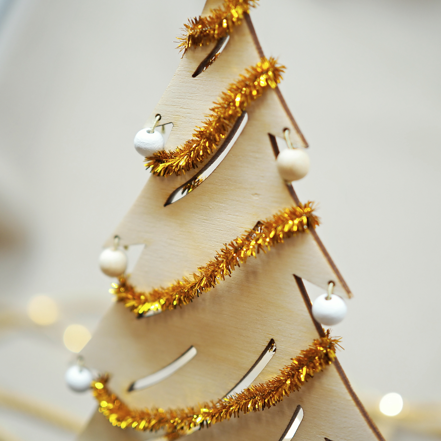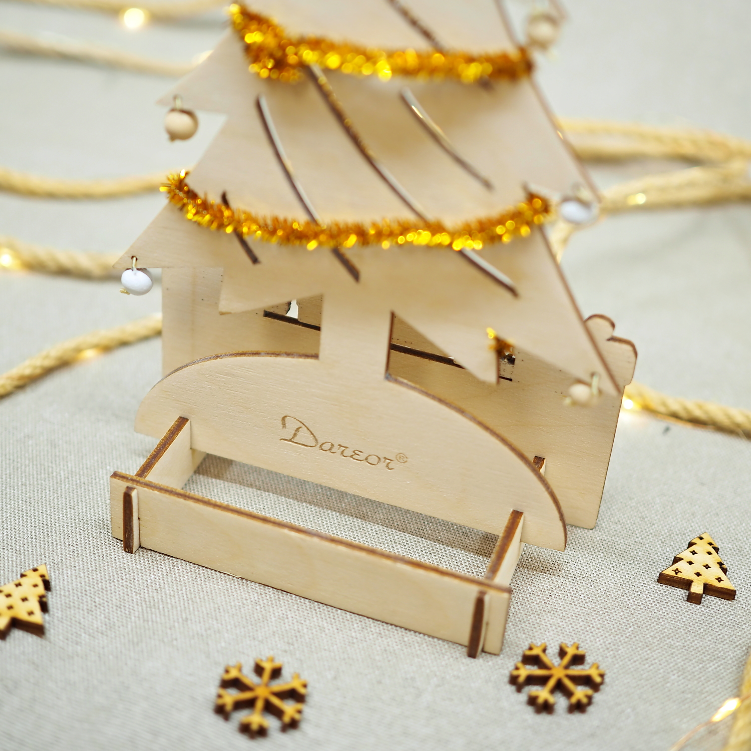 Stromček je z preglejky v hrúbke 3 mm. V zloženom stave má výšku 26,5 cm, šírku 12,5 cm a hĺbku vrátane stojančeka 6 cm. Je balený v rozloženom stave v elegantnej krabičke s čiernym molitanom. Po otvorení jednoducho zložíte 5 preglejkových dielov a na záver si ho ozdobíte dvoma priloženými vianočnými reťazami a ôsmimi drevenými ozdobami.
