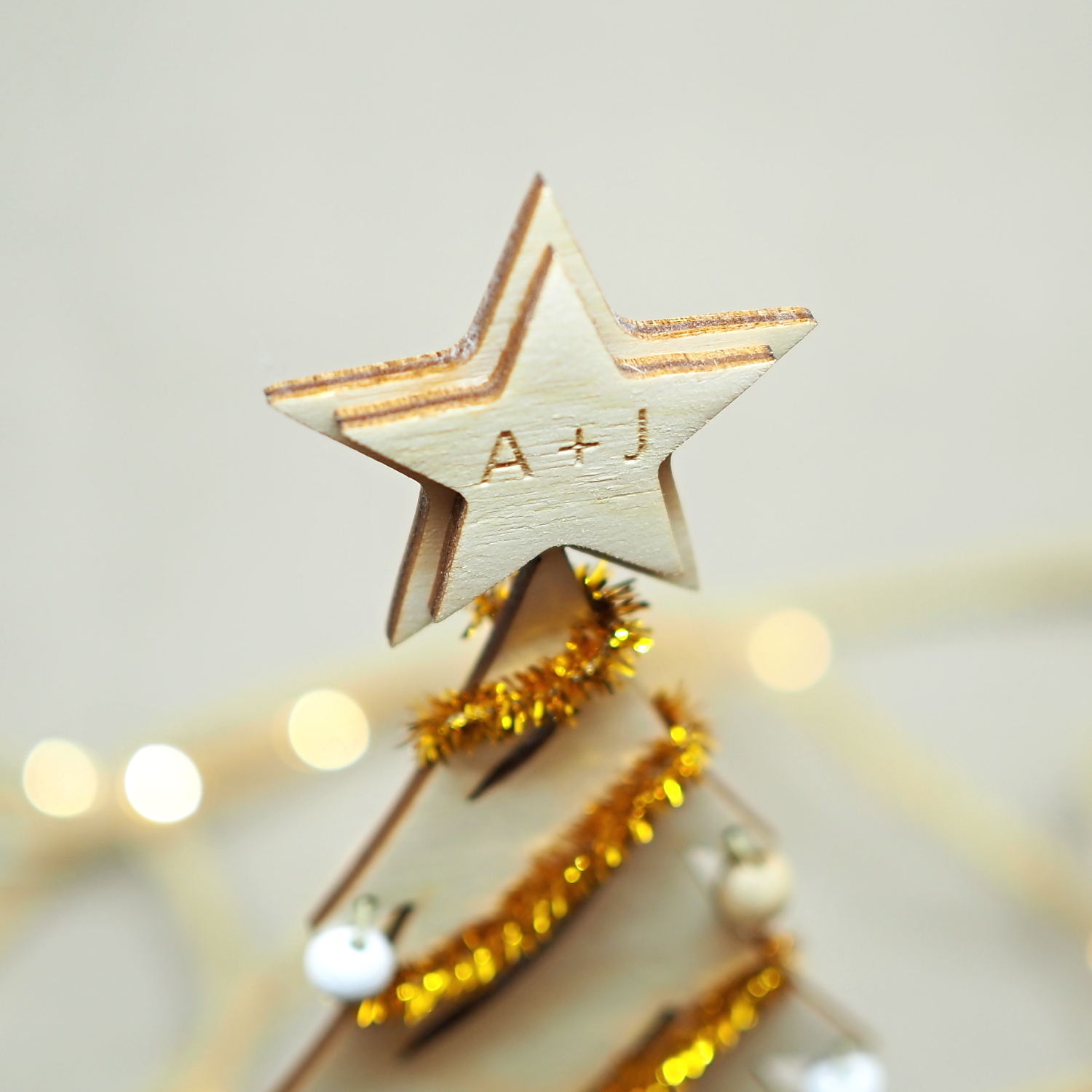 Vianočný stromček je zhotovený z preglejky, je vyrezaný a gravírovaný pomocou lasera, brúsený, lakovaný a opatrený stojančekom na použitie na stole. Stromček obsahuje vyčnievajúcu hviezdu, na ktorú je možné umiestniť veľmi krátky text. Na dlhší text alebo prianie je určená plocha pod darčekmi v spodnej časti.