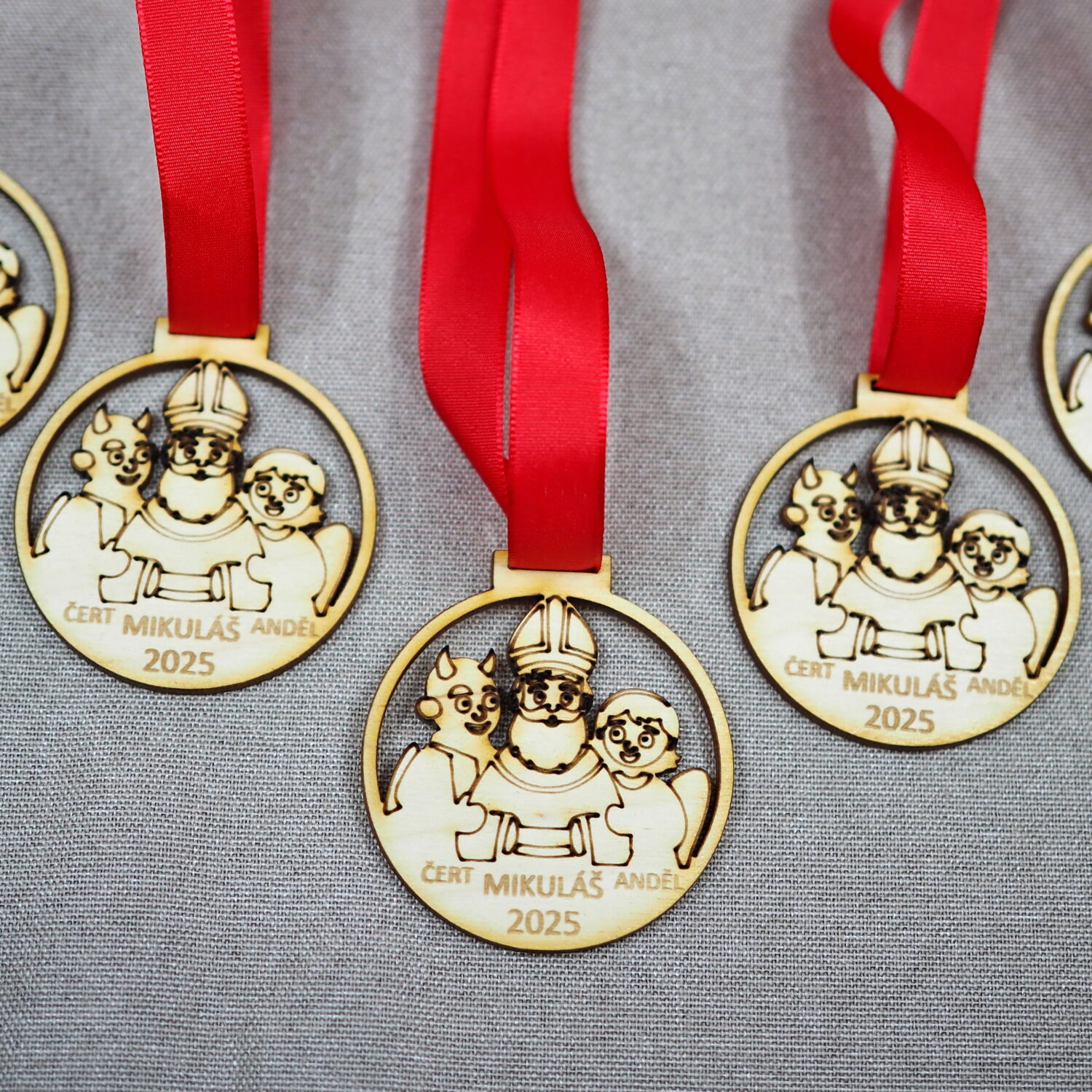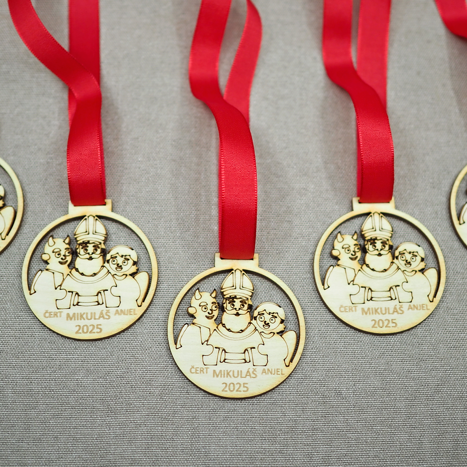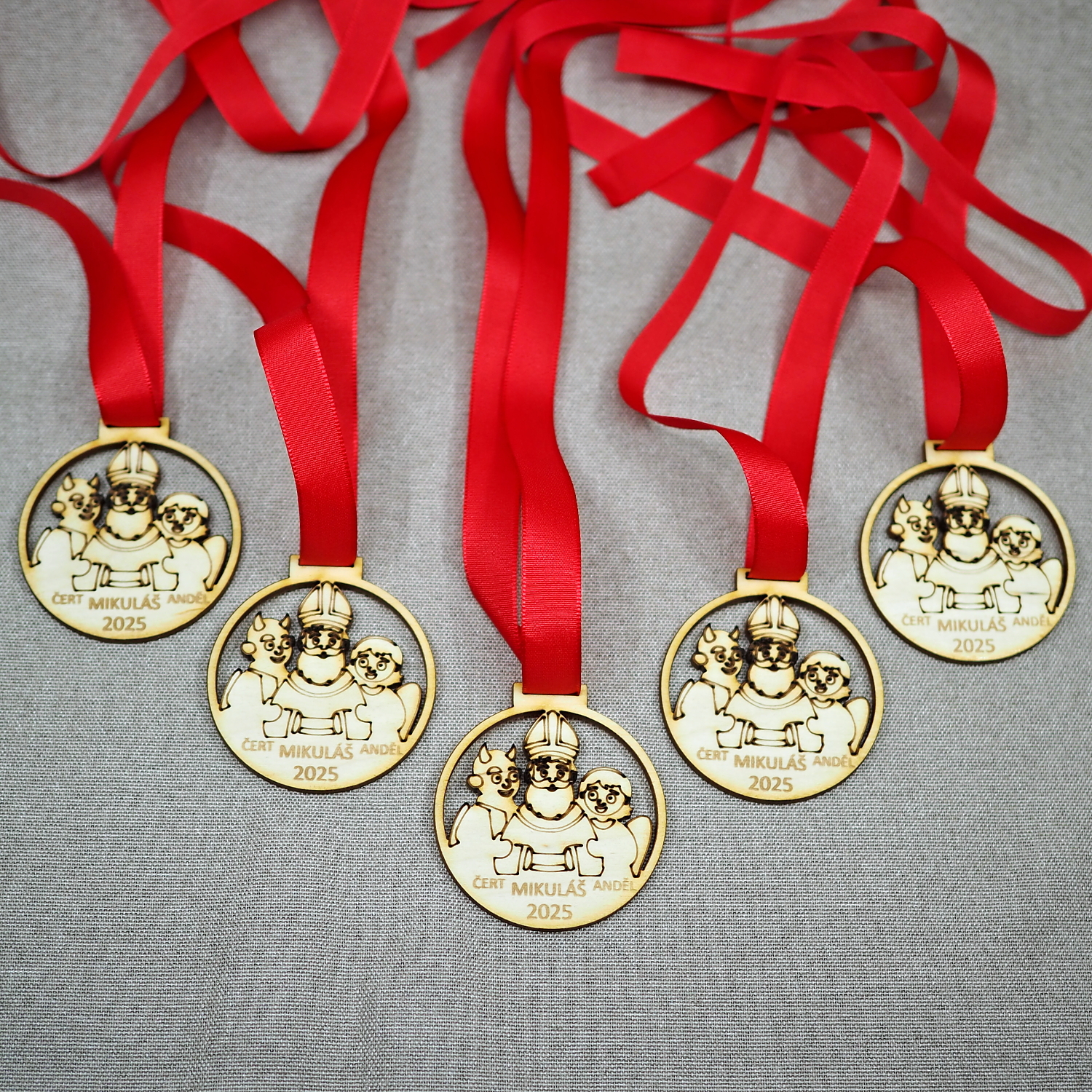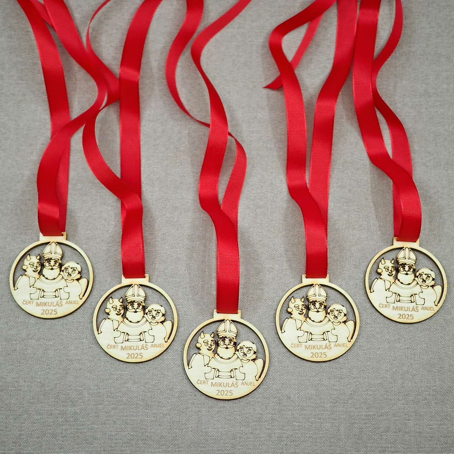 Malá drevená medaila (Mikuláš, anjel a čert) ako odmena pre deti alebo spomienka na Mikuláša 2025. Medaila je zhotovená z preglejky v hrúbke 3 mm, má priemer 6 cm + 0,5 cm úchytka na stuhu, ktorá je súčasťou balenia. Zasielame v plastovom vrecúšku.